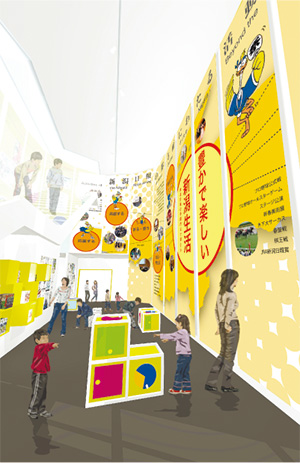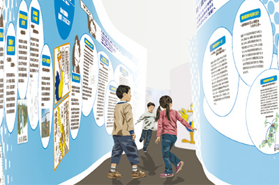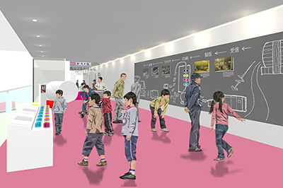 抜け出すと黄色のエリア。新潟県の出来事と新潟日報の関わりが分かる年表や、事業や防災拠点機能などさまざまな取り組みを伝えています。また、シアターには新潟日報販売店グループのマスコットキャラクター「ニック」が映像で登場。新聞についていろいろ解説します。