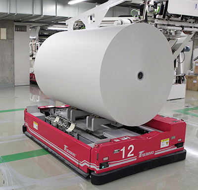 新聞に印刷する前の紙は、巻かれた状態で直径は1.2m、幅は1.6m、重さは1.3tでトイレットペーパーのような形です。重さはトイレットペーパー8000個分。延ばすと長さは19キロになります
