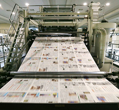 新聞を印刷している大型輪転機。紙の流れるスピードは時速30kmです。午後の部では実際に印刷している様子を見学できます。