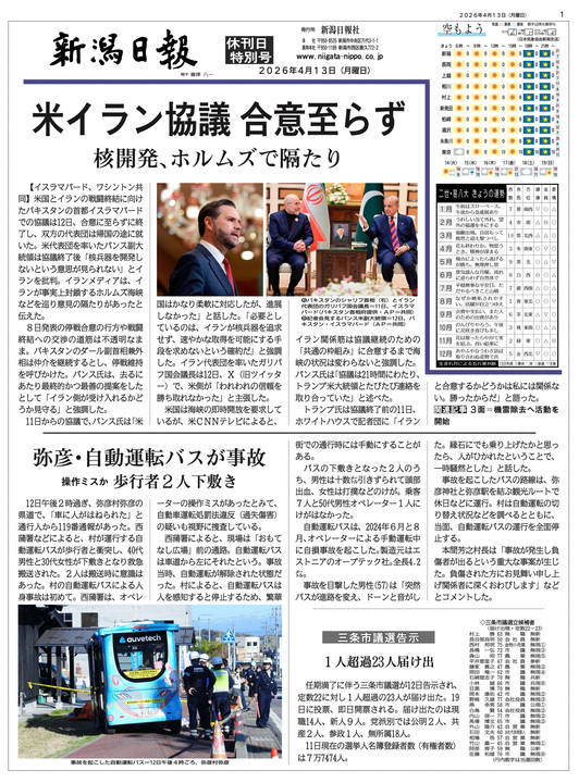 [新潟県知事選挙2026]告示まで1カ月 3氏が名乗り、支持拡大へ本格始動…5月31日投開票 花角英世知事の2期目の任期満了に伴う知事選は、5月14日の告示まで1カ月となった。これまでに、3選を目指す現職の花角氏(67)に加え、立憲民主党所属で県議1期目の土田竜吾氏(37)=上越市=、元五泉...
