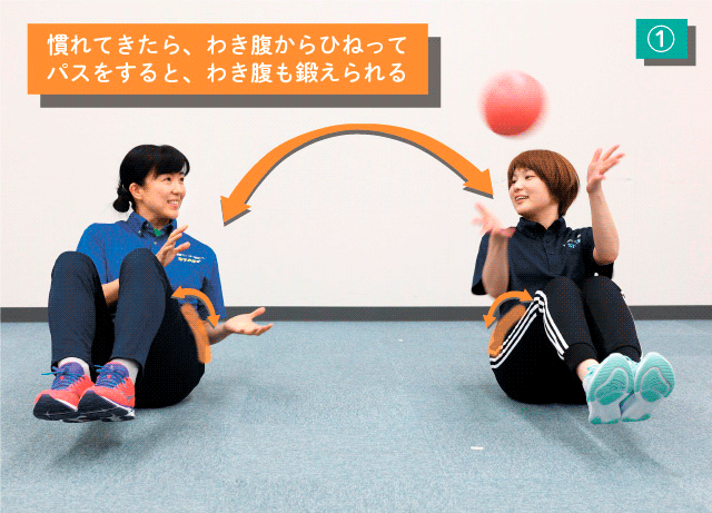 (2)脚を床から離した状態をキープして、お互いの胸に向かってボールを順番にパスする。
