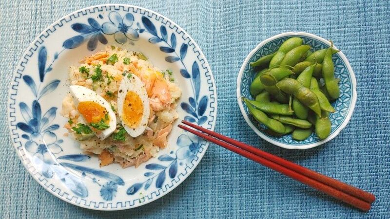 鮭とぬか漬けの入った「新潟ポテトサラダ」と黒埼茶豆