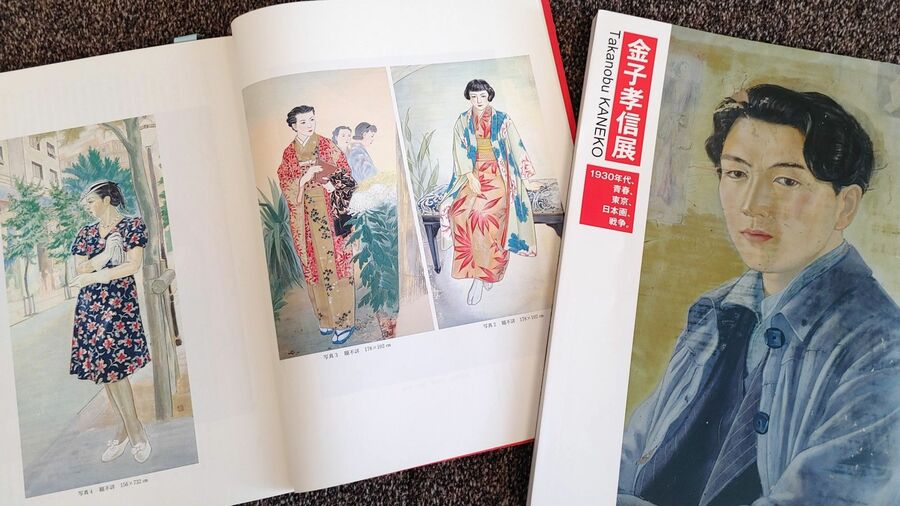 2014年に新潟市美術館で開かれた金子孝信展の図録(右)。孝信の自画像が表紙になった。その横は、沼垂ビールのラベルに使われた絵などを収録した「ある戦没画家の青春 金子孝信の絵日記Ⅰ」