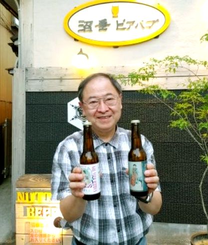 沼垂ビールで造った「恋すてふ」と「新潟オールドデイズ」を手にする高野善松さん=新潟市中央区の沼垂ビアパブ