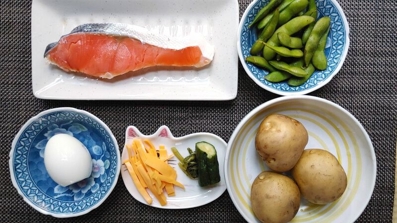 材料(2人前) ジャガイモ3個、甘塩鮭一切れ、キュウリのぬか漬け2分の1本(カブ菜もあったので少々入れた)、チーズ二切れ、ゆで卵、マヨネーズ大さじ2、酢とオリーブ油、砂糖少々、塩は好みで