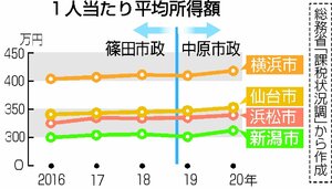 市町村税の課税状況に関する総務省の統計から新潟市の1人当たり平均所得を計算すると、中原市政下で数値は上向いている。篠田前市政だった2016年は、全国20政令市で最下位の300万1千円。それが中原氏就任後の20年には312万円に増えた=グラフ参照=。