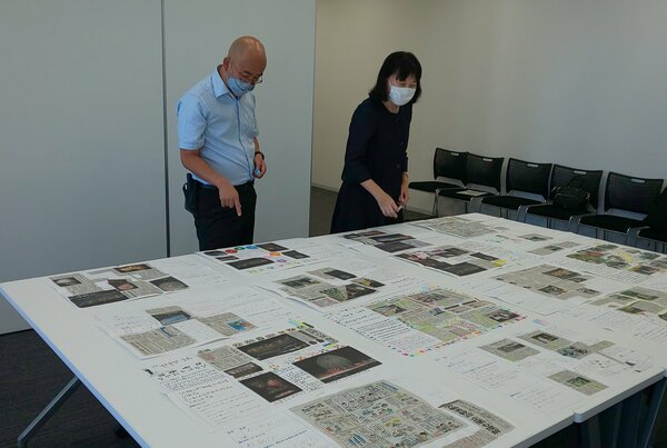 10月4日(土)、「第11回新聞スクラップコンテスト2022」(新潟日報社主催・新潟県NIE推進協議会後援)の「1次審査」が行われました。今年も全県の小学校から600点を超える多数の応募がありました。審査は県NIEアドバイザーの生田恵子教頭(新潟市立東青山小学校)と牛腸昌克教諭(新潟市立上所小学校)、津野事務局長の3名が担当しました。
