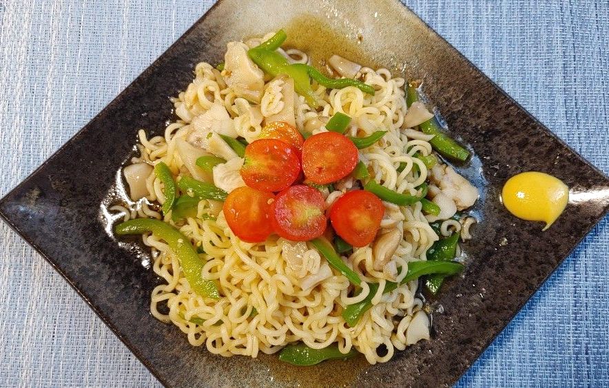【おまけ】残りの麺はサラダに。残ったスープの素を水で溶き、ぽん酢、ごま油と混ぜてドレッシングを作る(味は好みだが、やや濃い目に)。麺と切ったマイタケ、ピーマンをゆで、水で冷やす。ドレッシングであえる。プチトマトを飾り、からしを添える。