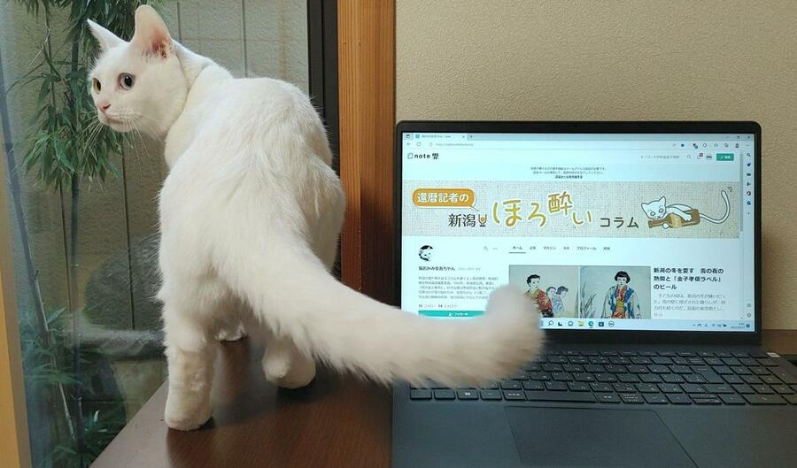 デジタルコラムをチェックする猫おかみ。冬毛で尻尾もふわふわに