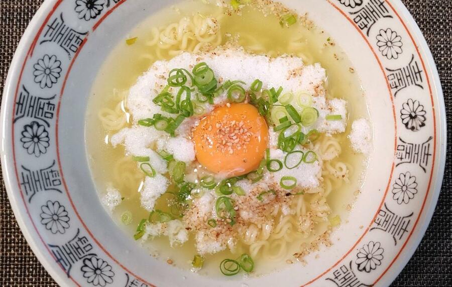 「サッポロ一番塩らーめん」で作った月見ラーメン。黄身が壊れたら「雲隠れラーメン」に名前を変更