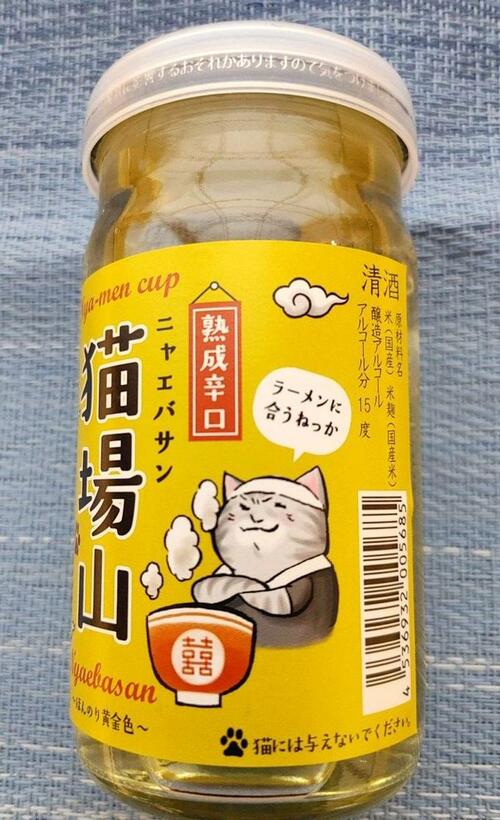 月見ラーメンには、どんな酒を合わせよう。ラーメンにマッチするカップ酒として、津南町の苗場酒造が販売しているのが「熟成辛口 猫場山(ニャエバサン)」だ。