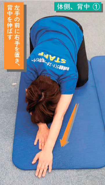 (1)床に膝と手をついて四つんばいの姿勢になり、手を肩の真下より少し前に出す。