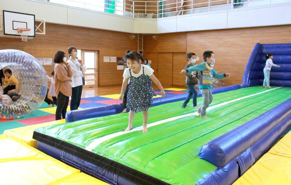 保育園の遠足で訪れていた村上市の6歳の園児は、エアトランポリンの上で飛び跳ねたり、弾力を感じながら駆け抜けたり。「疲れたけど、走るのが楽しい」と息も弾む。園児の母親(42)は「家だとゲームや動画ばかり。雨や雪の日でも、広い体育館で目いっぱい体を動かして遊べていい」と目を細めた。