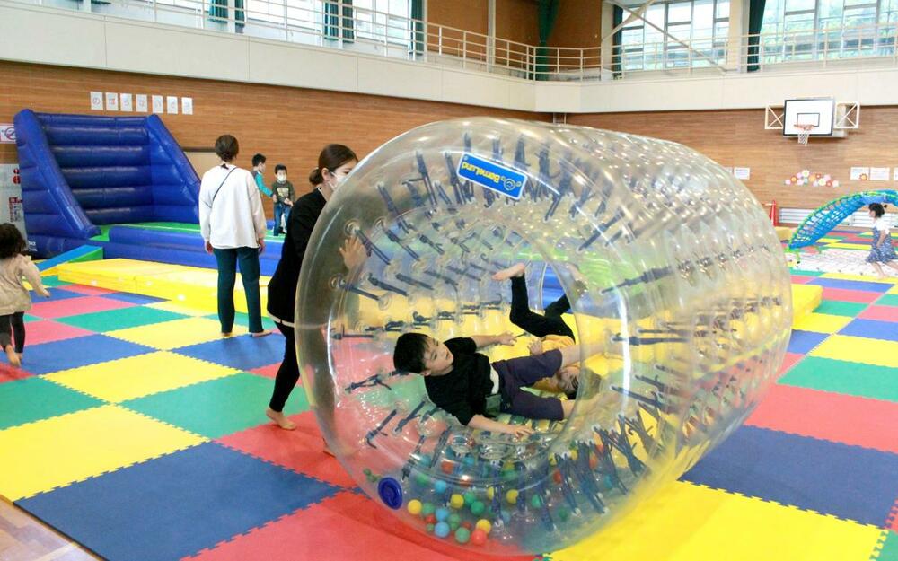 体育館の半面はカラフルなジョイントマットが敷かれた遊具ゾーンで、空気で膨らませた巨大エア遊具が目を引く。人気を集めるのは、筒の中に入って転がったりできる「サイバーホイール」や、長さ約10メートルの「エアトランポリン」だ。