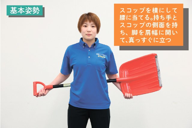 スコップを横にして腰に当てる。持ち手とスコップの側面を持ち、脚を肩幅に開いて、真っすぐに立つ。
