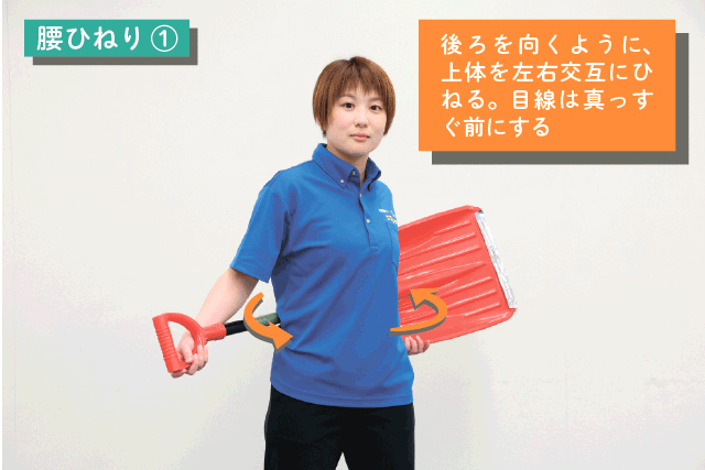 後ろを向くように、上体を左右交互にひねる。目線は真っすぐ前にする。10〜20回を目安に行う。