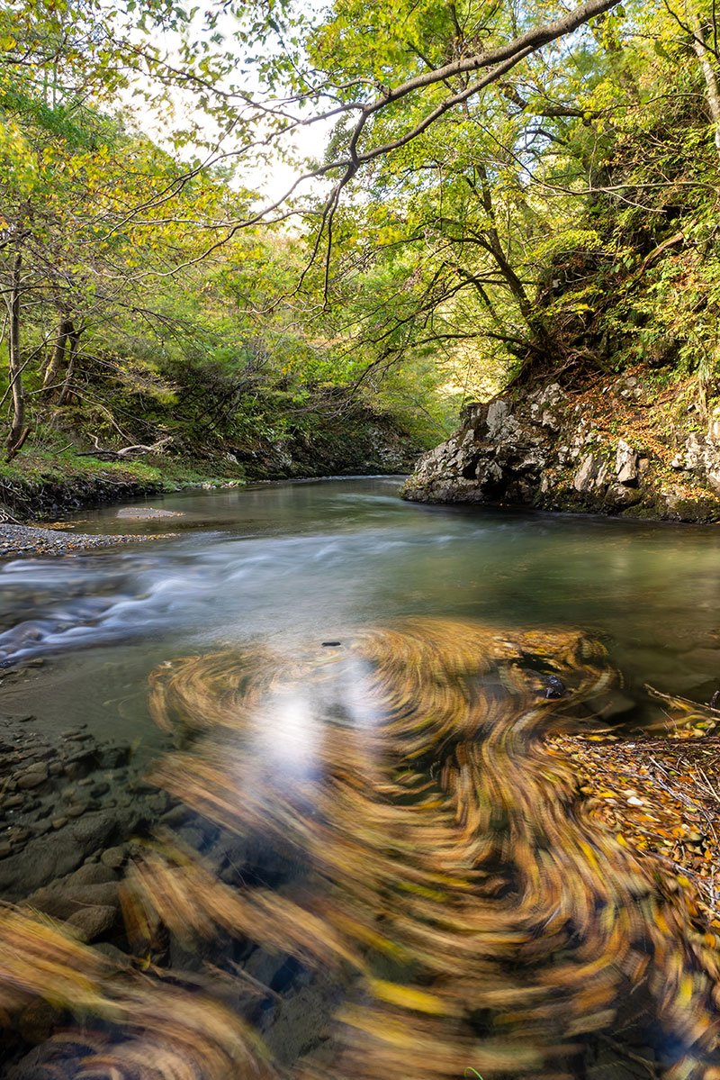 通行止めバリケードの手前で車を降り、カメラを持って門前川の河原に下りる。平野部から少し山手へ入っただけなのに風景は一変、深い森に囲まれて、秘境のような雰囲気だった。