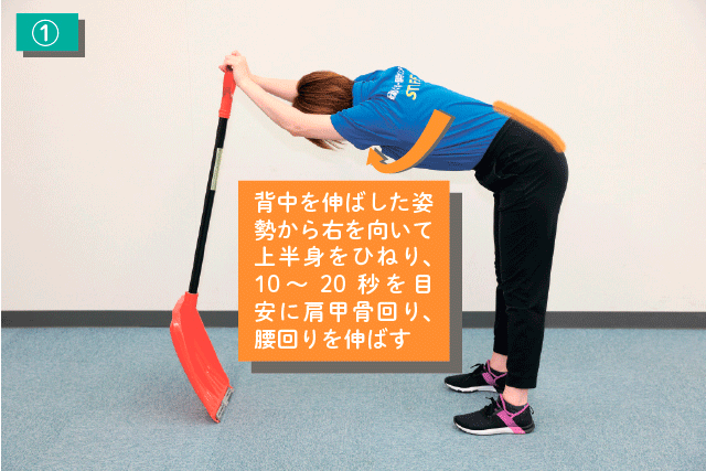 前回に続き、雪かき用のスコップを使います。広範囲の筋肉をほぐすことができるので、雪かき前の準備運動としてもお薦めです。