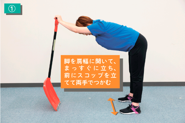 (2)上半身を前に倒し、スコップを上から押すようにして、10〜20秒を目安に背中を伸ばす。