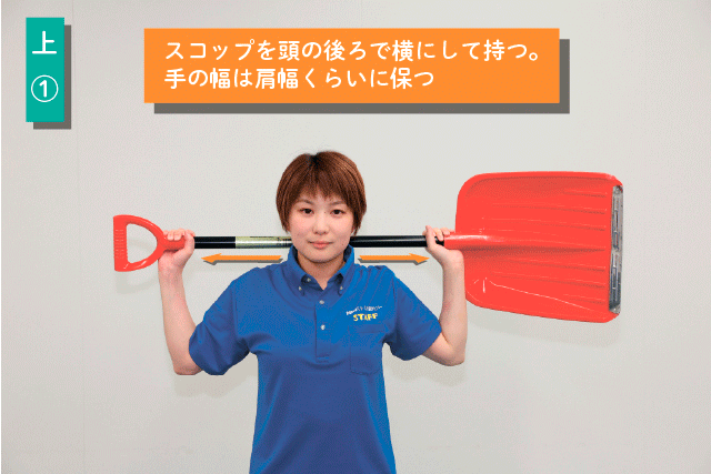 (1)スコップを頭の後ろで横にして持つ。手の幅は肩幅くらいに保つ。