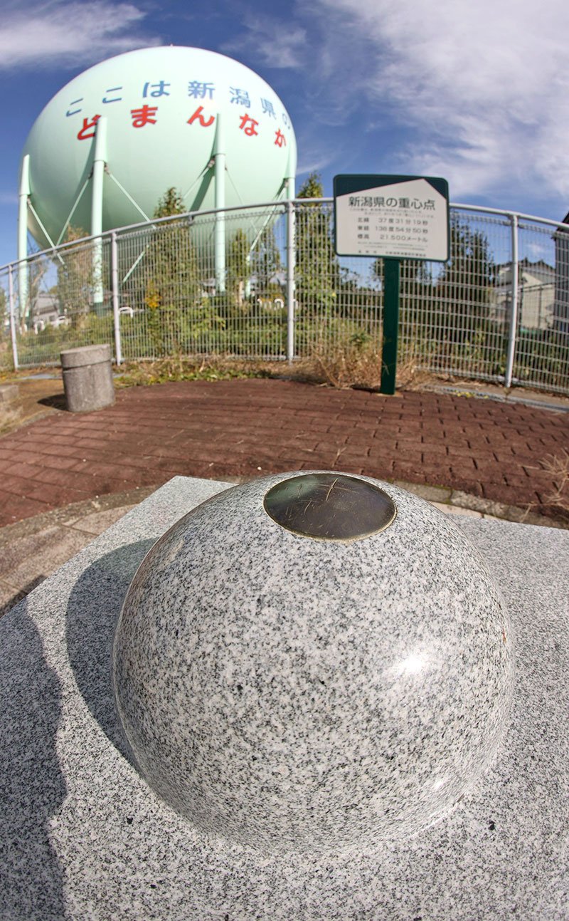 それもそのはず、見附市葛巻2の北緯37度31分19秒、東経138度54分50秒に位置する地点が新潟県の重心点、いわばへそに当たるからだ。県の地図を切り抜いて糸でつるすと、ここでバランスが釣り合う。