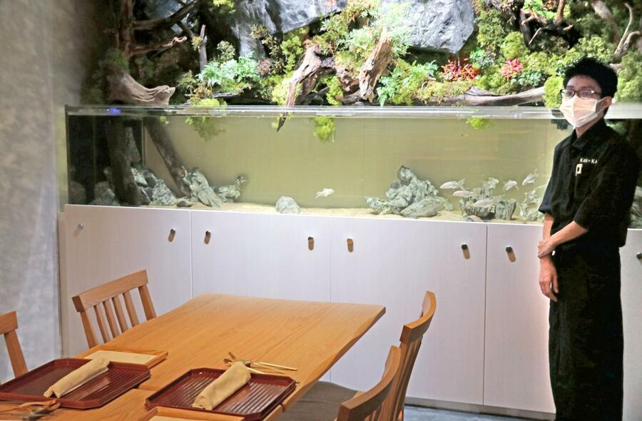 魚が悠々と泳ぐ水槽を眺めながら、新潟県産食材を生かしたヌーベルシノワ(新感覚の中華料理)はいかが-。新潟市中央区花園1のJR新潟駅前にある飲食店「感化(かんか)」が、店内にアクアリウムを設置。「新潟県の観賞魚」に選定されている錦鯉などの淡水魚が泳ぐ空間を演出し、来店客らを楽しませている。