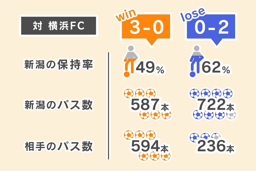 キーワードは「パス」。新潟が敗れた試合は、いずれも相手のパス本数が200〜300本台と少なく、かつ新潟がボール保持率で上回っていることだ。