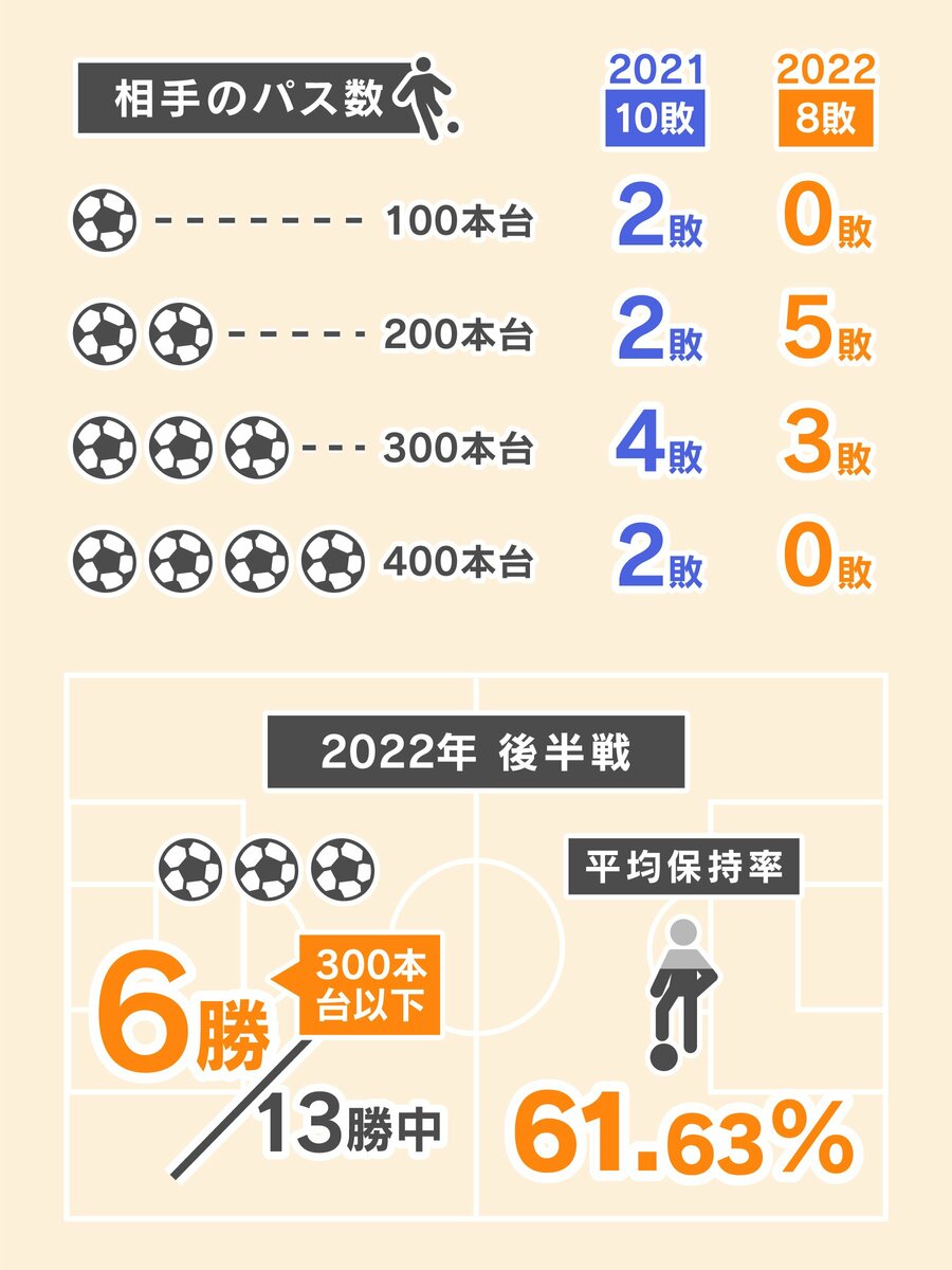 終盤に失速した要因の一つに勝ちきれなかったことがある。後半戦は1試合平均の保持率が62・22%。引き分けた9試合中8試合は、相手のパス本数が300本以下で、敗戦時のデータと実に似ている。