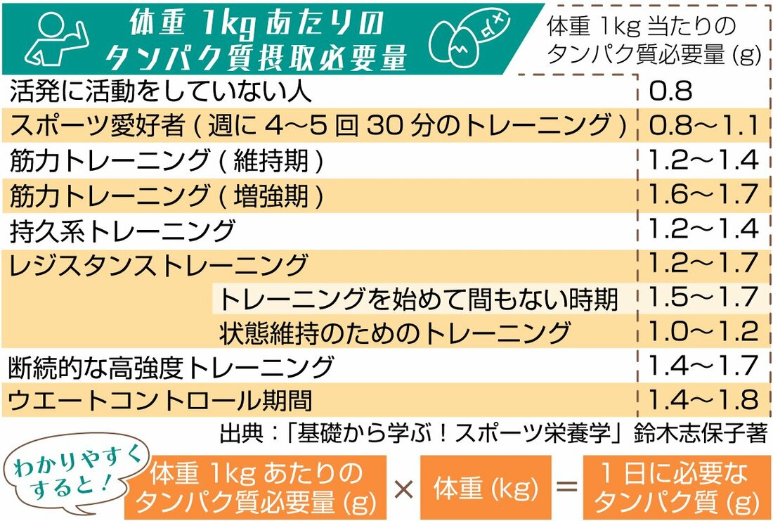 長谷川さん 基本的には、お母さんがおっしゃっている通り。1日に必要なタンパク質量が分かる計算式があります=下の図参照=。例えば体重50キロで、持久力トレーニングを行う選手だと、1日に必要なのは60〜70グラム。穀類にもタンパク質は含まれているので、プロテインを取るほどの量ではないかなと思います。