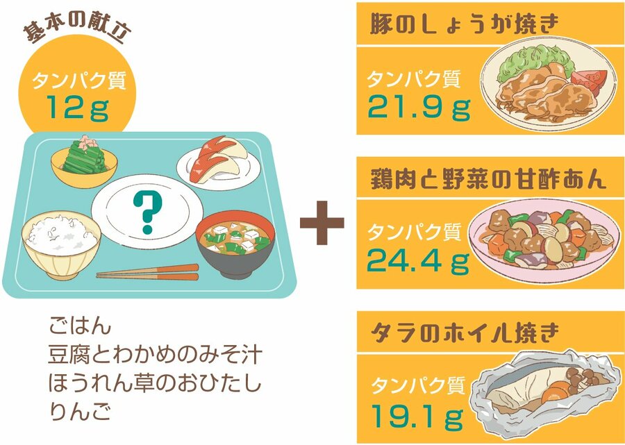 例えば、豚のしょうが焼きなら、基本の献立と組み合わせると12g+21・9gで、タンパク質の合計は一食で33・9gとなる