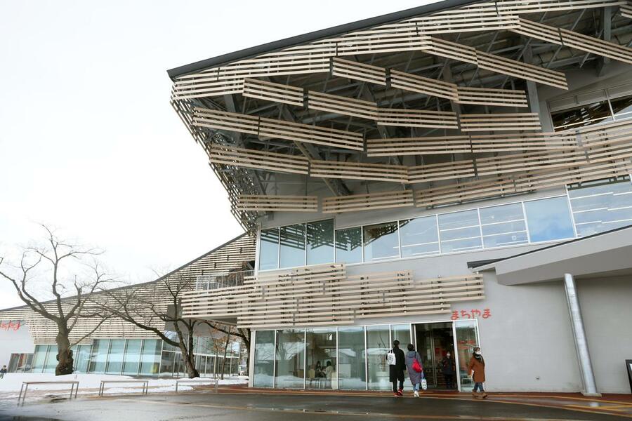 木をふんだんに使った大きな屋根が目を引く。三条市のJR北三条駅前にある市図書館等複合施設「まちやま」は、休日に工作体験や映画上映など多くのイベントが催される。科学教育センターと鍛冶ミュージアムを併設し、学びも遊びもできる憩いの場として、親子連れでにぎわっている。