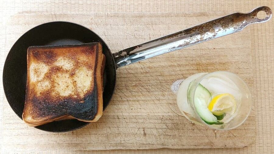 薄めの食パンを2枚用意し、それぞれ片面にバターを塗る。フライパンに、バターを塗った面を下にしてパンを1枚置き、溶けるチーズを載せる。もう1枚のパンを、バターを塗った面を上にして重ねる。あとは焼くだけ。焦げ目をしっかり付けようとしたら、焼き過ぎてしまった…。