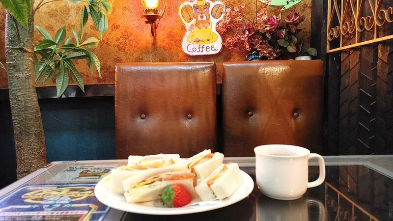 ミックスサンドは純喫茶ロンドンの人気メニューの一つ。店内にはテーブルゲーム機が残る