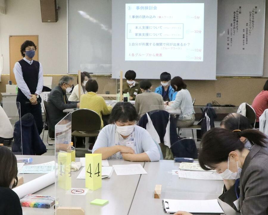 村上市で行われたひきこもり支援研修会。村山賢さん(左)らがアドバイスした=2021年10月