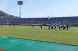 ラントレーニングをする選手たち。今年のトレーニングウエアは水色。緑色のピッチに映える=1月23日