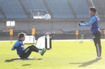 GKは分かれてトレーニングを行うことが多い。阿部航斗選手(手前)がボールをしっかり見て、手を伸ばす=2月2日