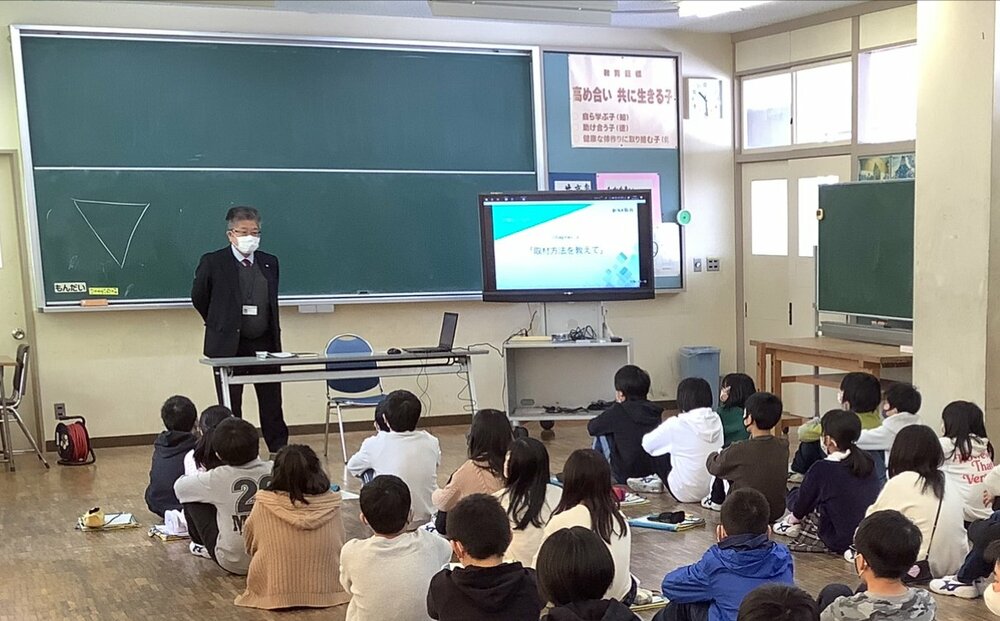 原室次長は、新聞社の仕事について「新聞記者には記事を書く取材記者と、見出しを付けたり,レイアウトをしたりする整理記者がある」「記者は伝えたいことは『先に書く』逆三角形を心掛けて書いている」などと語った。児童はメモを取りながら熱心に聞き入っていた。