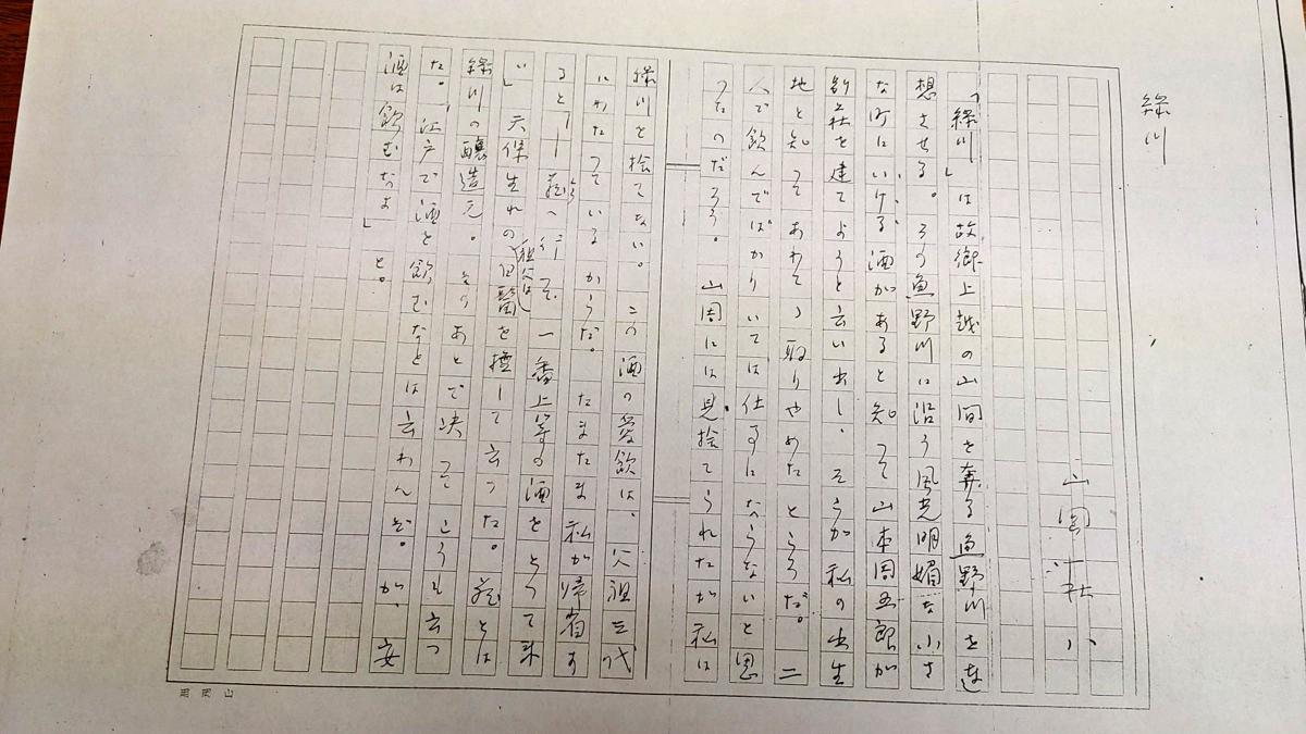故郷の酒、緑川について山岡荘八がつづった直筆の原稿=緑川酒造所蔵