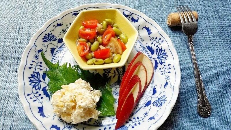左手前がいぶし大根のクリームチーズあえ。奥がいぶし大根と豆、トマトのサラダ。頑張ってリンゴを木の葉切りにしました
