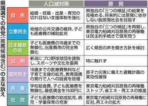 共産と社民はともに再稼働反対を訴え、省エネルギーや再生可能エネルギーの拡大を主張する。共産候補は政府の方針を「福島の現実をないがしろにした」と強調。社民の推薦候補は「再稼働には住民投票が必要だ」と訴える。