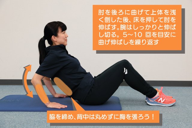 (2)肘を後ろに曲げて上体を浅く倒した後、床を押して肘を伸ばす。腕はしっかりと伸ばし切る。