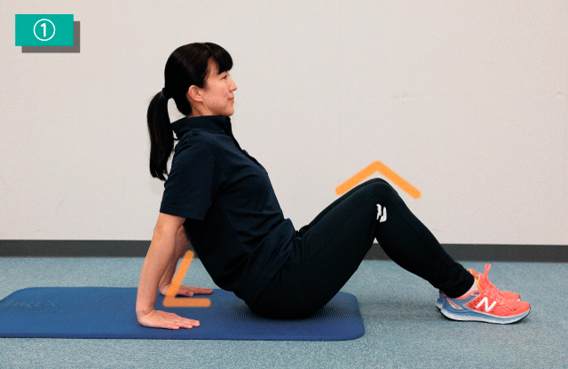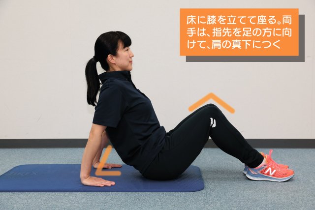 (1)床に膝を立てて座る。両手は、指先を足の方に向けて、肩の真下につく。