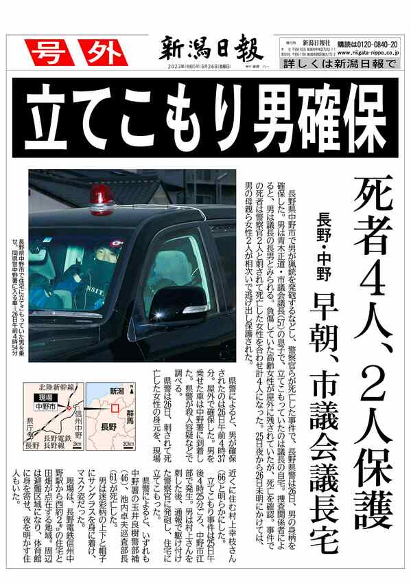 【号外】長野県中野市・立てこもりの男を確保 死者4人、2人を保護 2023/5/26 7:50 (最終更新: 2023/11/17 10:46) PDFで号外を見る トップページで最新情報を見る 関連ニュース 新潟県最難関の山はどこ?徹底解説「山のグレーディング」安全登... 2025/9/18 海水温上昇で魚種に異変、漁業者の収入減…難題に直面する水産業... 2025/7/13 森を育み魚も育んで…密接につながる自然界、魚の繁殖を助ける「... 2025/7/13 食卓彩る魚介類、1人当たりの年間消費量はピーク時の半分に…そ... 2025/7/13 記録的不漁続く鮭、サーモンの陸上養殖で代替なるか?費用のハー... 2025/7/13 夏のスタミナ源が「貴重品」に?県内で減りゆくドジョウ、このま... 2025/7/13 年々増える「海のプラごみ」少しでも減らすには?「拾う人を増や... 2025/7/13 「新潟県内唯一の水産教育」守り続け…実習に力入れる海洋高校、... 2025/7/13 藻場の“厄介者”どう売り込む?「人が少ない」を言い訳にせず…... 2025/7/13 1人で船を操る姿に憧れ…隣県山形で初の女性船頭誕生、漁の世界... 2025/7/13 温暖化の一因となる牛のゲップ、「餌に海藻」で減らせるか?瓶内... 2025/6/9 新聞記事から生まれた「富山湾鮨」、自慢の地魚で人を呼び込み…... 2025/6/8