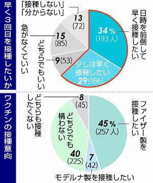回答者の479人(84%)が、3回目を「接種する(接種した)」とした。早期接種を希望する人は、「日時を前倒して早く接種したい」と「少しは早く接種したい」を合わせて359人(63%)だった=グラフ上参照=。
