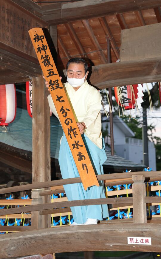 農作物の作柄を占う「御託宣」=2022年7月、新潟市中央区の蒲原神社