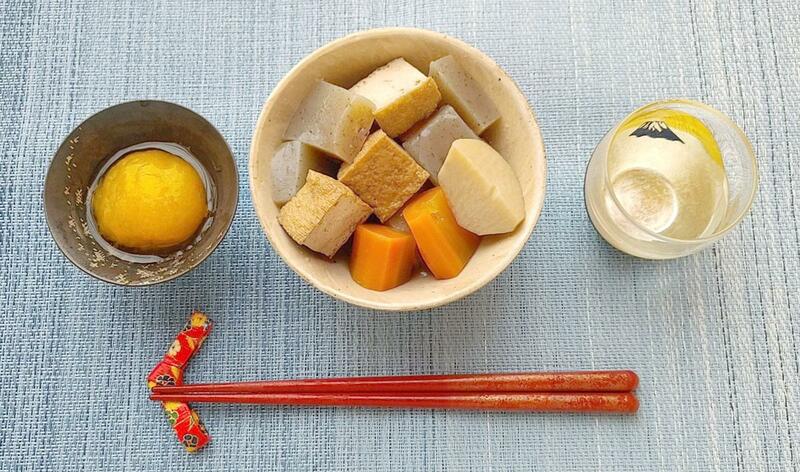 中央は奈良県の郷土料理のレシピで作ったのっぺ。左は完熟梅の自家製コンポート