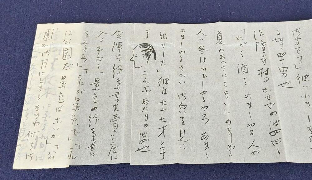 1908年8月、會津八一が、義弟の桜井政隆に宛てた書簡。奈良であまりに大酒を飲むので、宿の女性(横顔の似顔絵がある人)が見に来たという=新潟市會津八一記念館所蔵