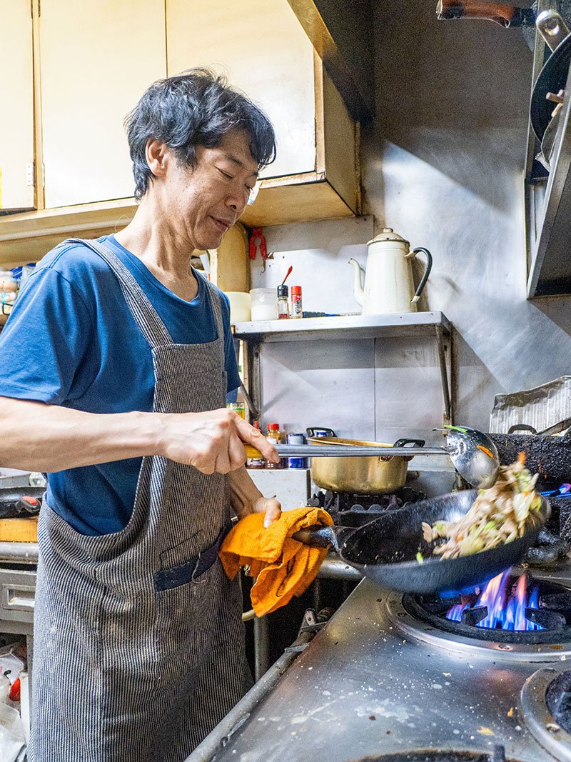 そんな飲みのお供に人気なのが、「肉野菜炒め」(1200円)。豚バラ肉をニンニクと一緒に炒めて塩コショウで味付けて、一度皿にあげておく。同じ中華鍋で今度は野菜を炒め、取り出しておいた肉を戻して、全体を絡めて完成だ。