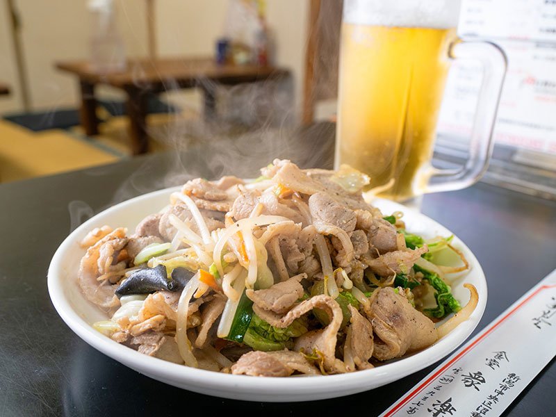 目の前に運ばれてきたそれにまず度肝を抜かれた。圧倒的ボリュームである。野菜炒めに肉チョロチョロではなく、肉ドーン&野菜モリモリ。適度に効いた塩味とコショウの辛みがビールのピッチを加速度的にアップさせる。