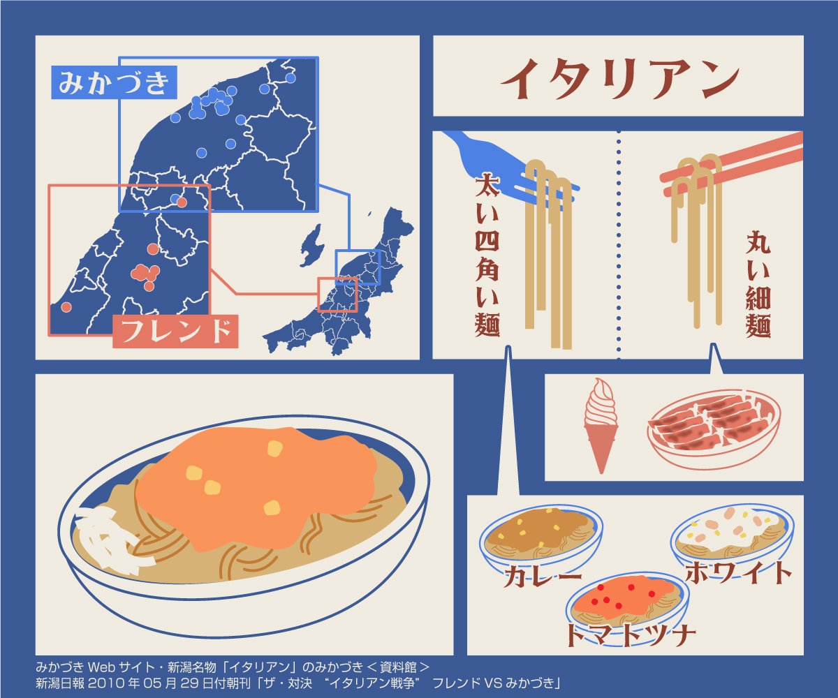 「イタリアン」は新潟県内で有名なファストフードで、いわゆる「B級グルメ」として親しまれている。県民の「ソウルフード」と紹介されることもある。県内では長岡市を中心に展開する「フレンド」と、新潟市などで店を出す「みかづき」で提供されている。